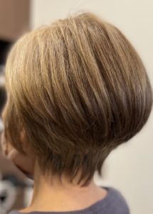 根元から毛先まで細かいハイライトを入れて白髪をぼかし、毛先も明るめの色なので伸びてくると根元の白髪とグラデーションのような感じで白髪と馴染み、暗めの白髪染めをしている時よりも気にならなくなります。